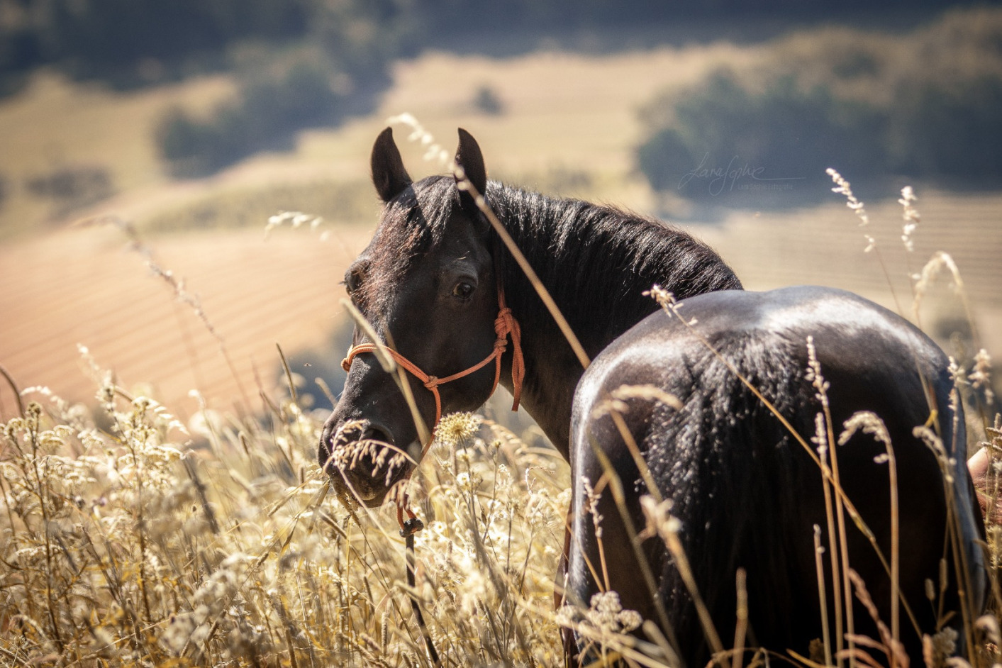 Möchtest Du freie Bilder mit deinem Pferd, das heißt ohne Halfter, Trense und co., aber dir fehlt die nötige Sicherheit, habe ich immer ein Fotografenhalfter dabei. Dieses ist sehr dünn und daher leicht zum wegretouchieren: